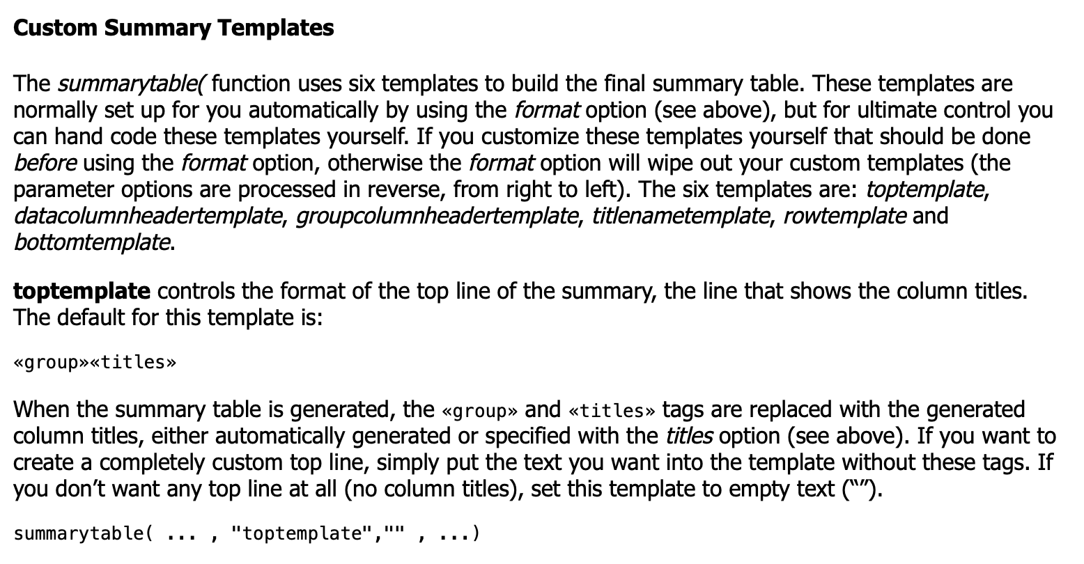 @admin, Is there an option in summarytable() to omit the Titles line directly, similar to how the nototals option removes the Totals line? I often use summarytable() and end up removing the Titles line manually because I don’t need it.