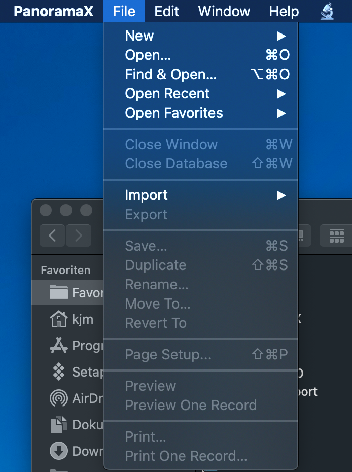 In a similar way, I was irritated that the menu item Open Favorites does not appear in the File menu, when I launch Panorama X without opening a database).