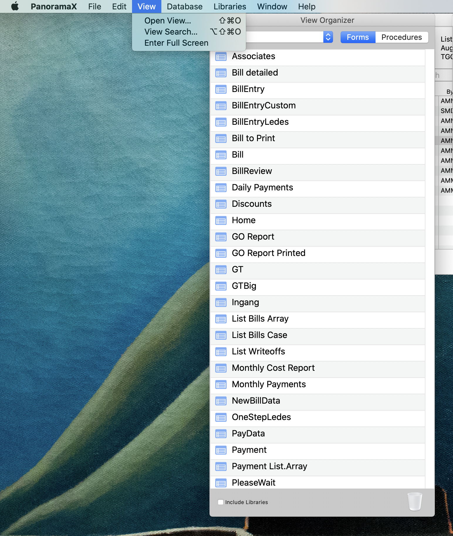 On 1 computer, using 1 db, I am not getting Forms or Procedures but ‘Enter Full Screen’ instead. Using other dbs on that computer, and using that db on another computer (these are shared files), the View menu properly shows Forms & procedures. There are 2 Forms open on the db that is experiencing this issue. (The second windows was opened via a button on the 1st Form. I then created a button with a procedure to OpenSheet which opened a 3rd window but still no Forms or Procedures.)