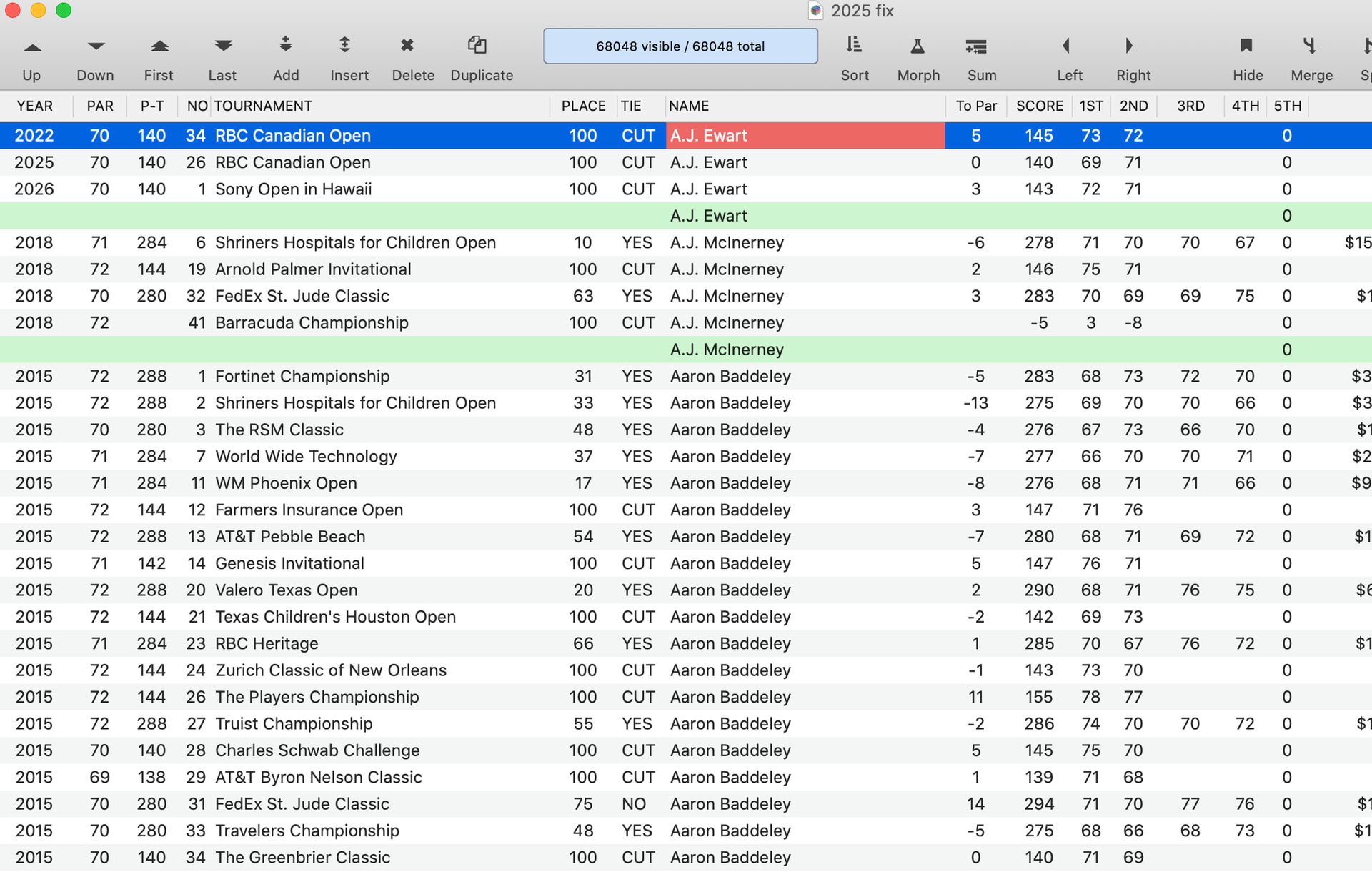 What does ‘sum it up for each player’ mean? Do you want to total the SCORE field for each player? Or perhaps the 1ST, and the 2ND, etc?