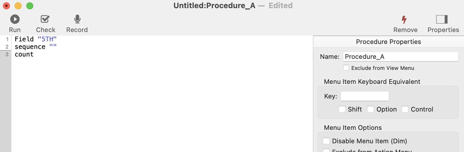 That was a procedure, not a formula. Field, sequence, and count are all procedure statements. Write a procedure with those statements and run it.