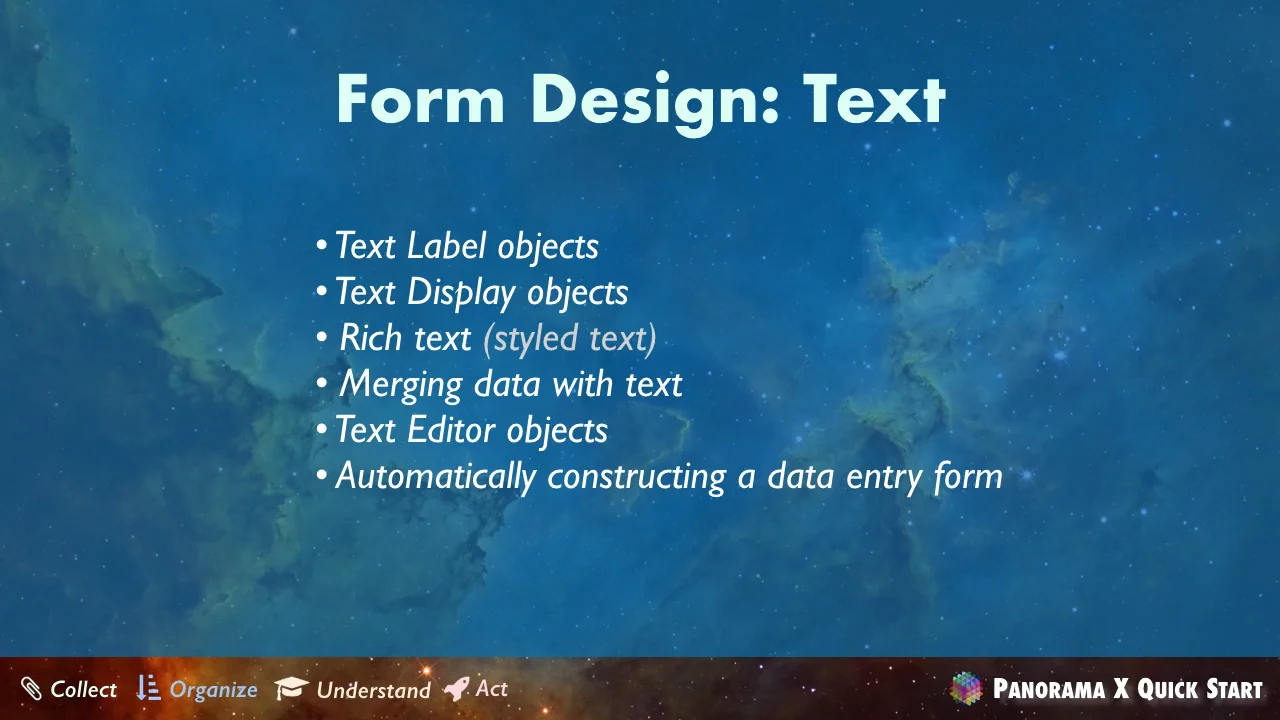 In PanX Help I didn’t know that I should search for Text Editor when I was looking for forms and fields. The search box didn’t even allow me to search for “fields” except fields for the data sheet, not how to connect them to forms. Maybe this is intuitive for young people and programmers but I’m not in those categories. Text Editor is not a search I would think of. Panorama must have been a lot easier in the beginning when I started.