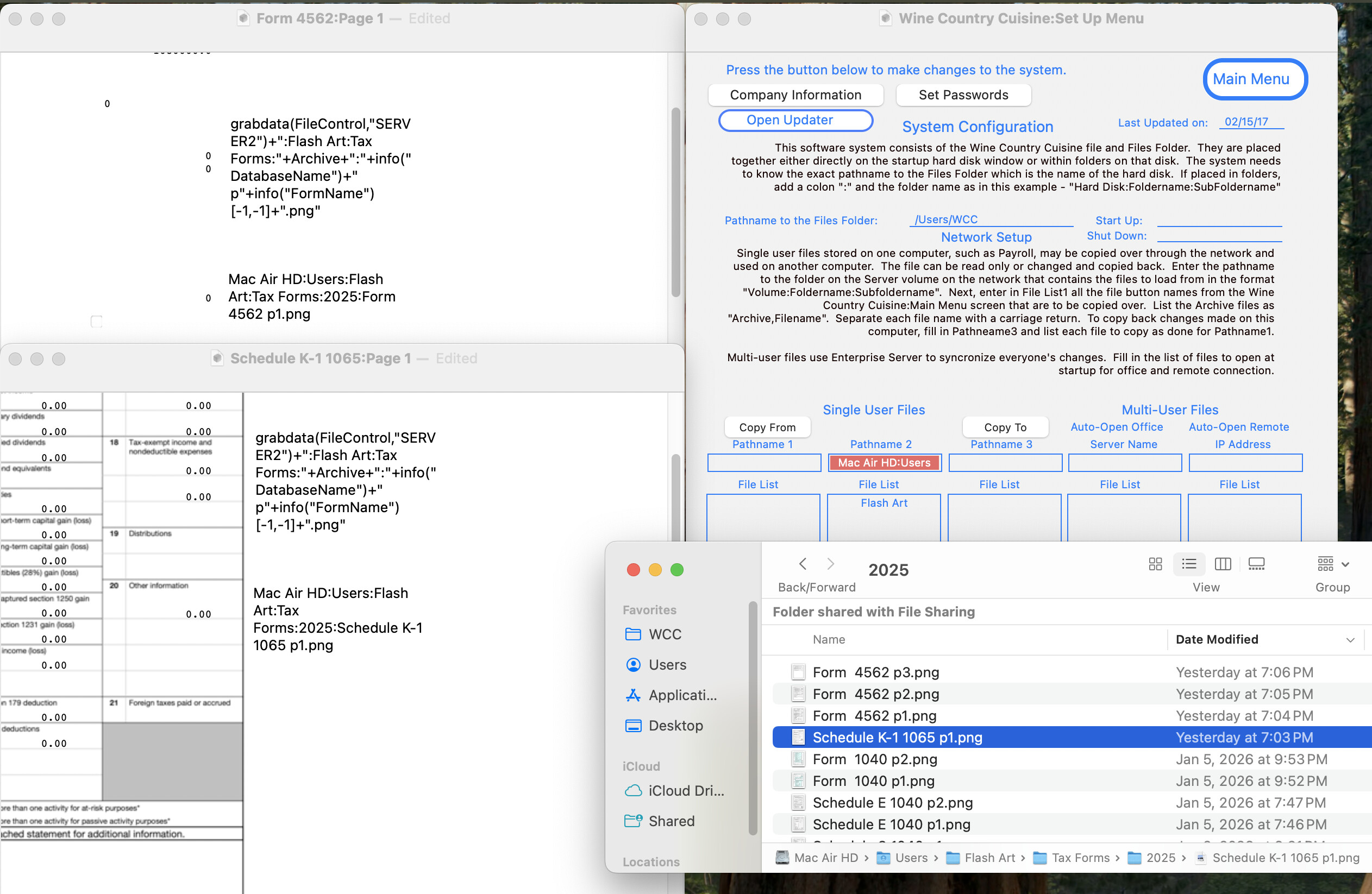 Tax time and in updating files for 2025. The image objects that display the tax from don’t for some files but do for others. The screen shot shows the image equation for Form 4562 and the calculated image pathname. The exact same image object in Schedule K-1 has the exact same equation giving the correct pathname and displays the image. The Server 2 in my Setup Menu allows all my customers’ file to access one folder of artwork.