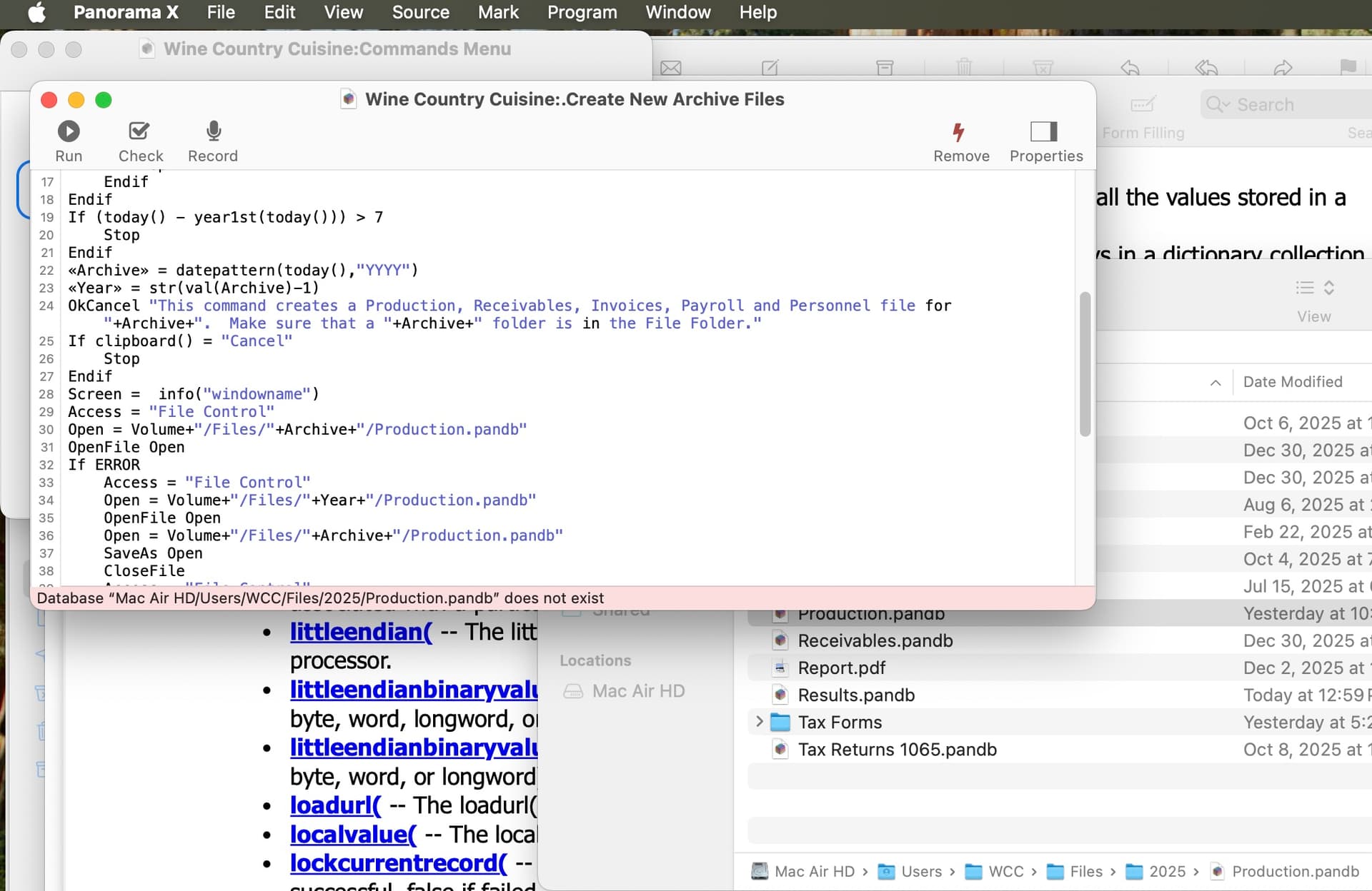 Here is a screen shot that shows the procedure code, the error message and the folder showing the file does exist. This procedure copies last year’s files, purges data as needed and saves them as this year’s files. I have used the variables “Volume” and “Open" to store file pathnames such that my files can run on any hard drive just by changing the Volume field in my Main Menu file. This code has worked since Pan 3.