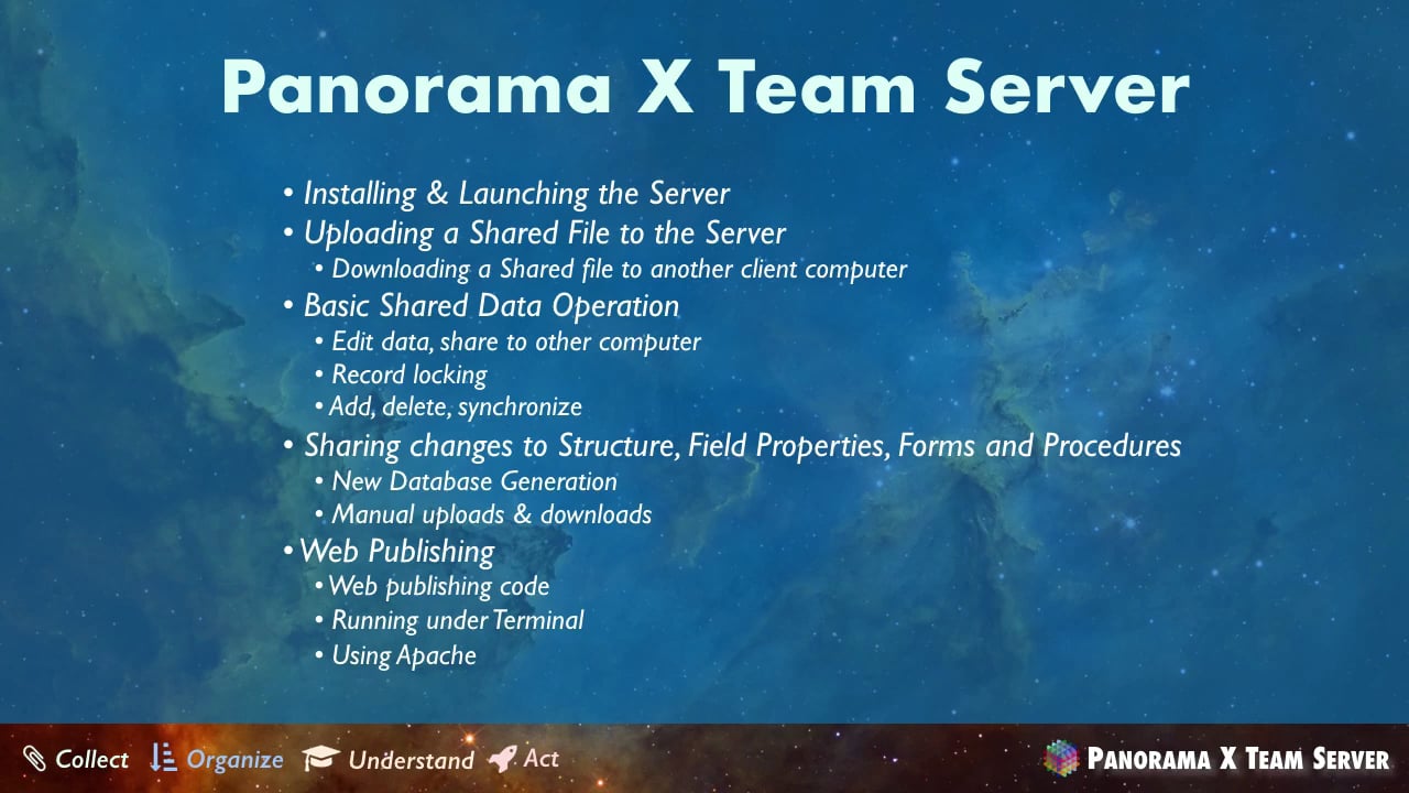 One further note – Panorama Server has two major components: database sharing and web publishing. As you can see from the video, Panorama X Server already includes both of these components. However the first priority for documentation and bug fixes is database sharing. This is because historically the web publishing features have been used by less than 10% of Panorama Server users. The plan is for the “final” release of the database sharing component to come first, with the final release of the web publishing component following later, possibly several months later. (As you can see, a lot of work has already been done on the web publishing component, this is because a) the sharing component uses the web technology as its underlying communication foundation, and b) I wanted to make sure that the server design would allow for web publishing.)