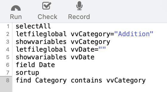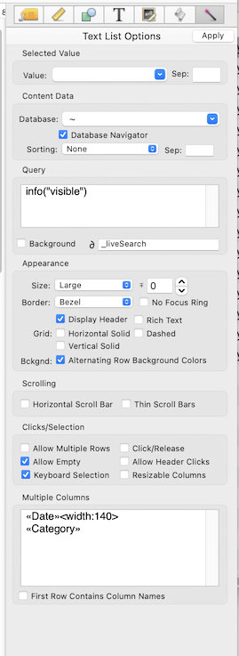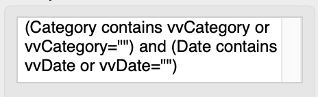 I have a button that calls a procedure to select all and a button to that calls a procedure to select a specific category. These work fine (thanks to kind people on this forum). I have attempted to make a button that will call a procedure to filter by a specific year. I can’t make this work. This is the Query box on the Text List Options: