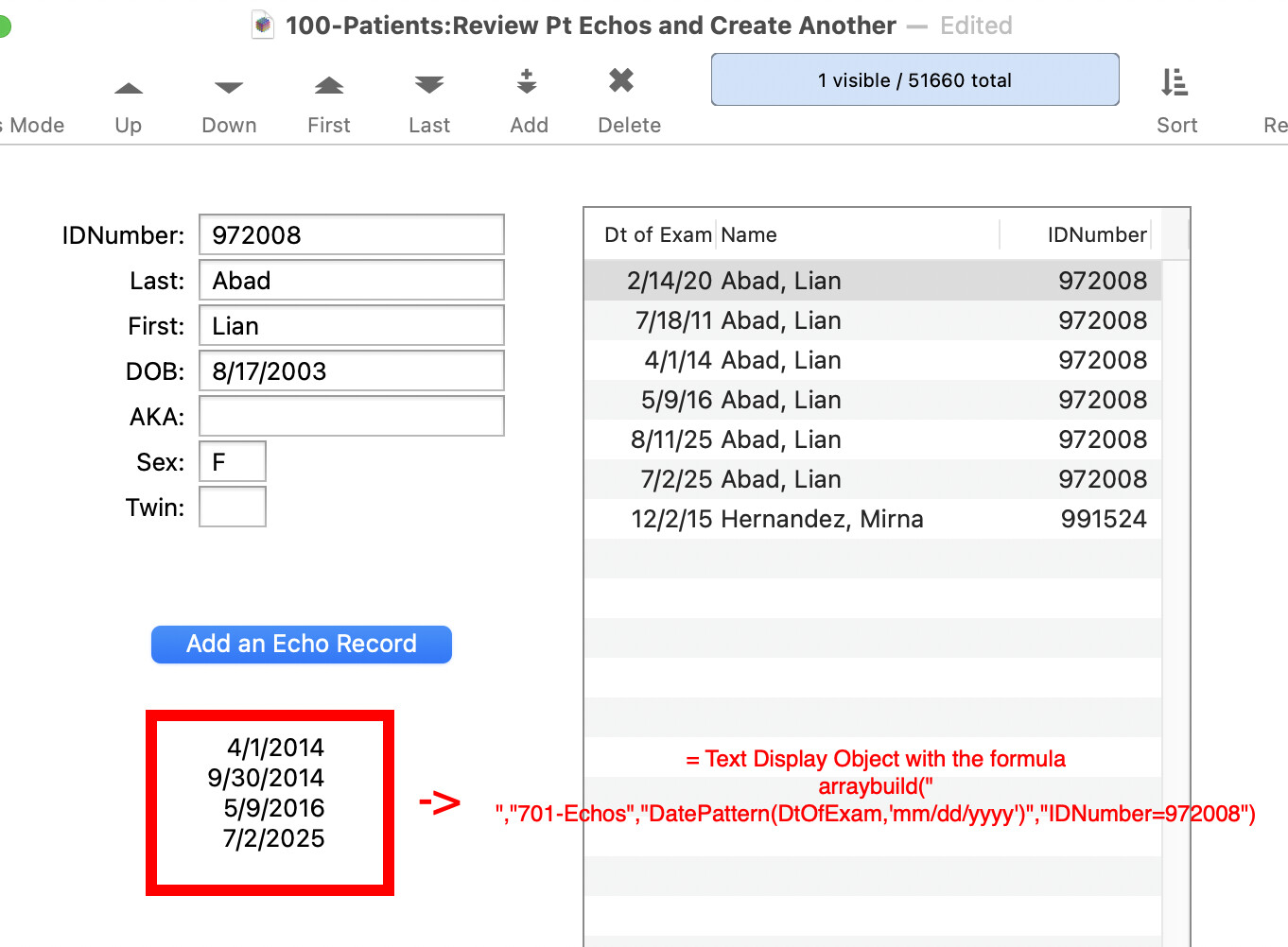 Now let’s revisit your assumption that “we are not able to have both the Data Sheet open while also having a Text List open”. This statement is far too broad, you can certainly have both open under many circumstances. What you don’t want to do is have a Text List that duplicates the navigation function of the data sheet. In other words it displays the same data as the data sheet in that database (not another database), and when you click on the Text List, it navigates to the clicked record. When all those conditions are met you’ll get spinning beachballs because the data sheet and the Text List will “fight” each other over who has control of the navigation of the database. But that’s not the situation you have. I think it would be fine in your case to have both the Text List and the database open at the same time. (By the way, in the situation where it’s not fine, the solution is not to create the Text List on the fly - simply make sure that the data sheet and the form containing the Text List aren’t open at the same time.)
