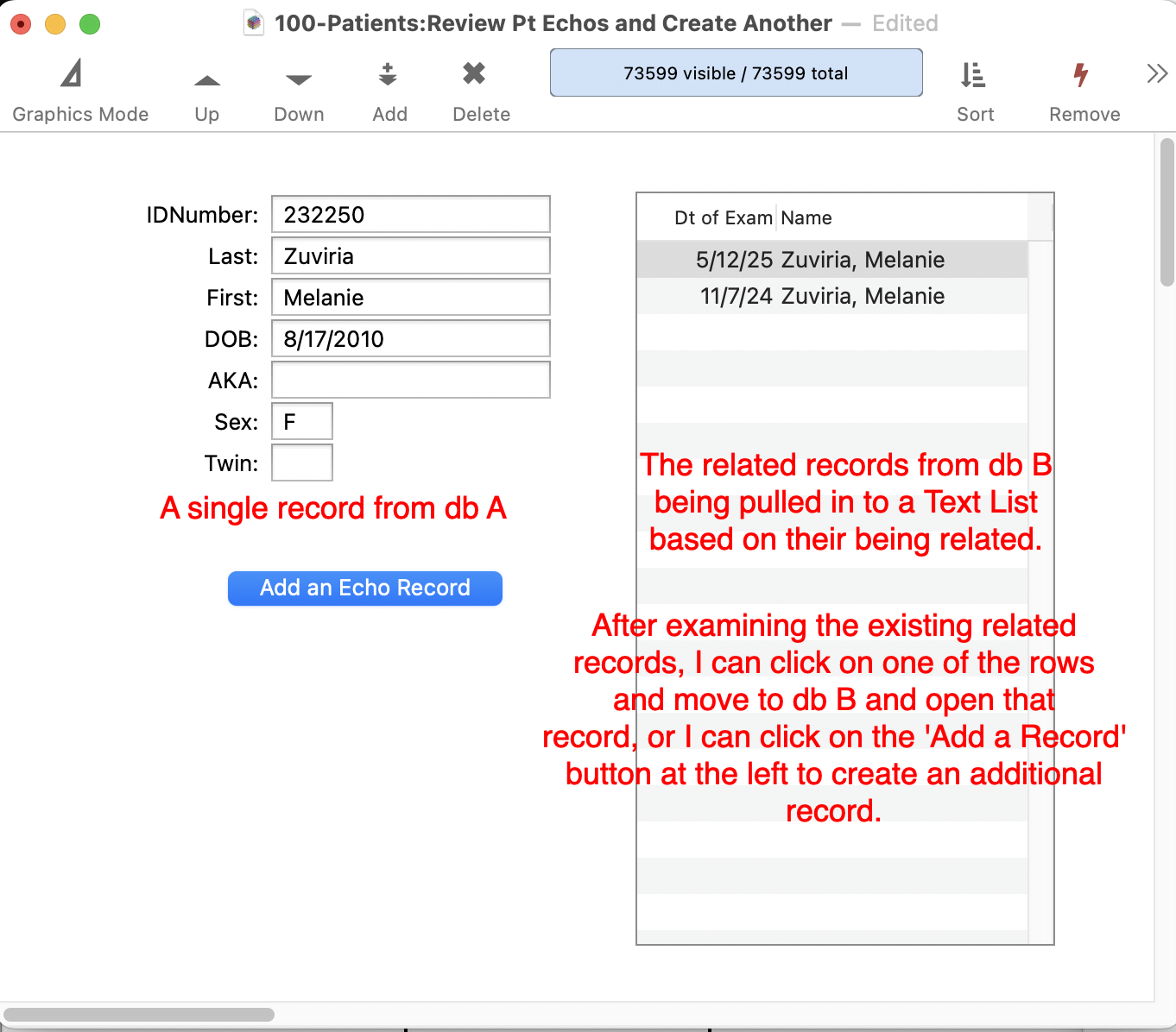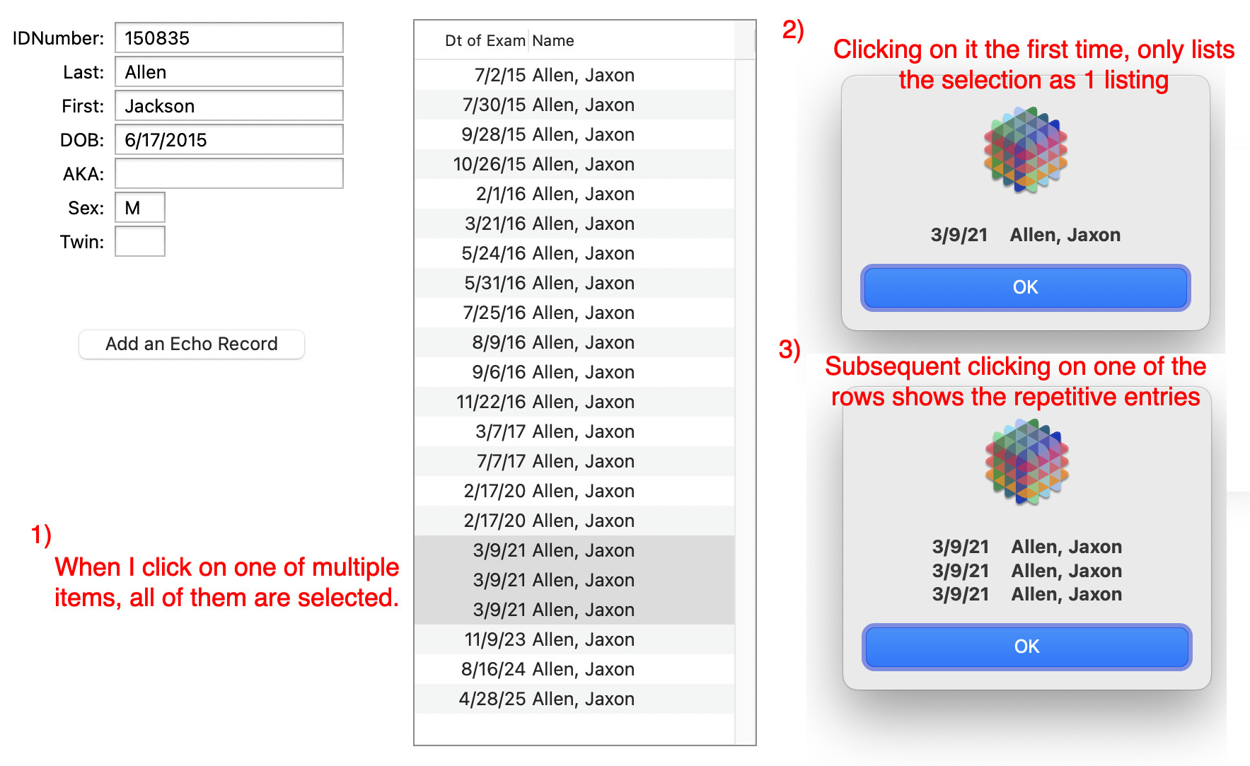 As for your new problem, I can’t really analyze that too closely because you haven’t provided any code. So I have no idea what “interrogate” means. But your list has duplicate entries, so of course there’s going to be weird behavior around selection. In this case I believe the Text List is actually operating on an array, not the second database directly (the array is built from the second database, but once the array is built the second database is not involved further - this is why it works ok with the data sheet). The array has duplicate values, there is no way to tell them apart. You need to devise a method to have all unique values - perhaps by including the appointment time, or some other unique component of each appointment. Right now your system could never work because you don’t have a 1:1 relationship between the items in the list and the records in database B. I’m assuming that Jaxon Allen really had 3 appointments on March 9, and there are three records for those appointments in database B. You need to pull in additional data into the text list to be able to make a unique key.