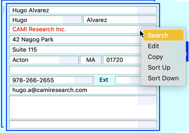 Double click: opens a popup menu with options for Search, Copy, Edit, Sort Up, and Sort Down.