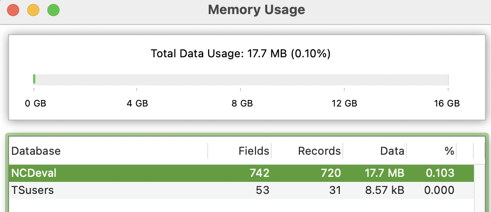 I imagine you are mentioning this because the memory usage window shows much lower values of 17.7MB and 8.57kB. This is because the memory usage window ONLY shows the amount of memory used by the DATA. The rest of the size you see in the Finder is the space used by forms and procedures. So your databases are mostly forms and procedures, especially the TSusers file which appears to be less than 1% data. Procedures are small, so maybe you have tens of megabytes of forms? I would think the only way to do that would be to have tens of megabytes of static images in the forms.